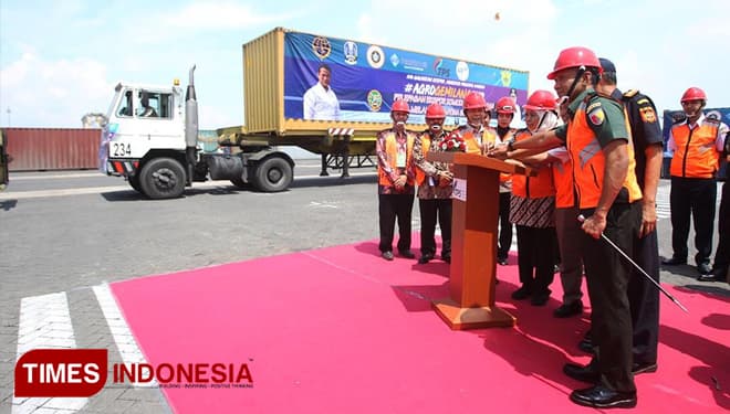 TIMES Sabang/Gubernur Jawa Timur. Dra. Hj. Khofifah Indar Parawansa saat melepas ekspor komoditi pertanian di Terminal PetikEmas Surabaya (TPS). Kamis (21/3/2019). (FOTO: TIM Media For TIMES Indonesia)
