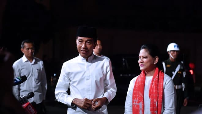 TIMES Sabang/Capres nomor urut 01 Joko Widodo bersama istri Iriana Joko Widodo tiba di lokasi untuk mengikuti debat Pilpres 2019 putaran kelima, di Hotel Sultan, Jakarta, Sabtu (13/4/2019). (FOTO: Rivan Awal Lingga/Antarafoto)