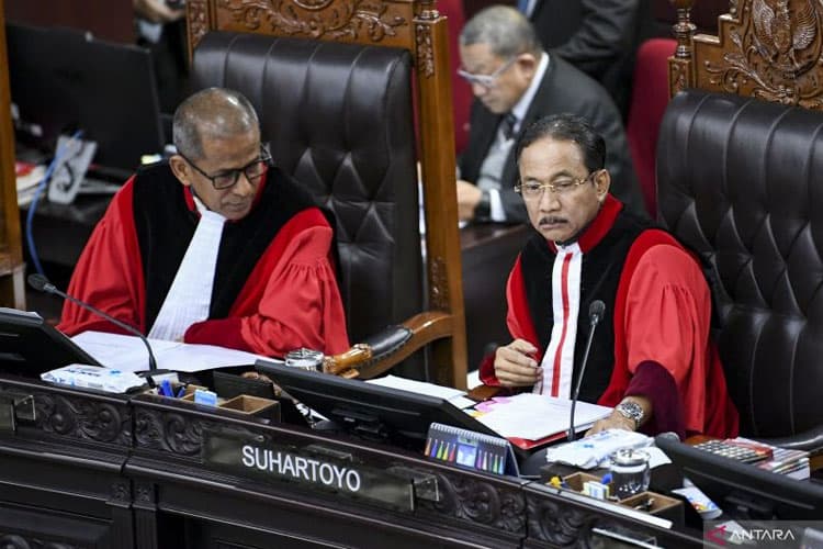 TIMES Sabang/Ketua Mahkamah Konstitusi (MK) Suhartoyo (kanan) bersama Wakil Ketua MK Saldi Isra memimpin sidang pengucapan putusan perkara dilanjutkan atau tidak (dismissal) sengketa Pilkada 2024 di Gedung Mahkamah Konstitusi, Jakarta, Rabu (5/2/2025). (ANTARA)