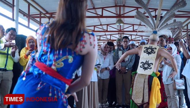 TIMES Sabang/Cawapres Nomor urut 02, Sandiaga Salahuddin Uno disambut dengan upacara adat Tetek Pantan saat tiba di Bandara Tjilik Riwut Palangkaraya, Kalimantan, Senin (04/02/2019). (FOTO: Tofik For TIMES Indonesia)